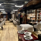 Es eröffnet sich dem Gast ein sehr großer, lang nach hinten verlaufender, einziger Gastraum, in den auf der zum Raumende gesehenen rechten Seite noch eine Bar integriert ist. Auf historische Möbelstücke oder Holzgebälk an der Decke trifft man beim Interieur hingegen nicht. Die Decke mit den großen Bögen ist unisono schwarz angestrichen, während die Wände in einem den Tischen entsprechenden Holzfarbton daherkommen. Noch einmal eine Stufe heller ist dann das Parkett. Zusätzliche Deko richtet sich vor allem an die Weinliebhaber, die in den Schränken, Nischen und sogar in Glasvitrinen verschiedene Flaschen bestaunen können.