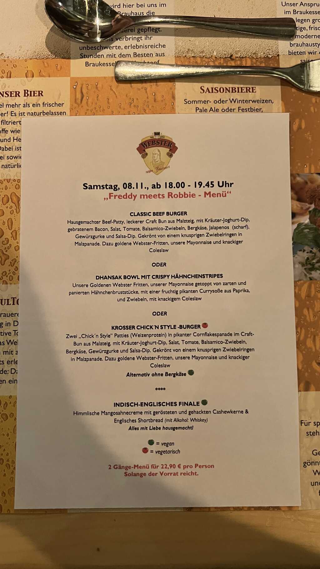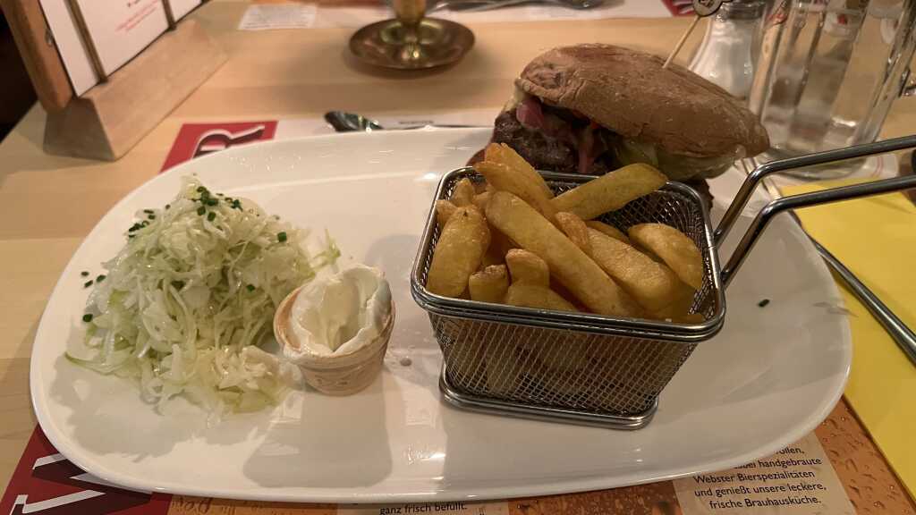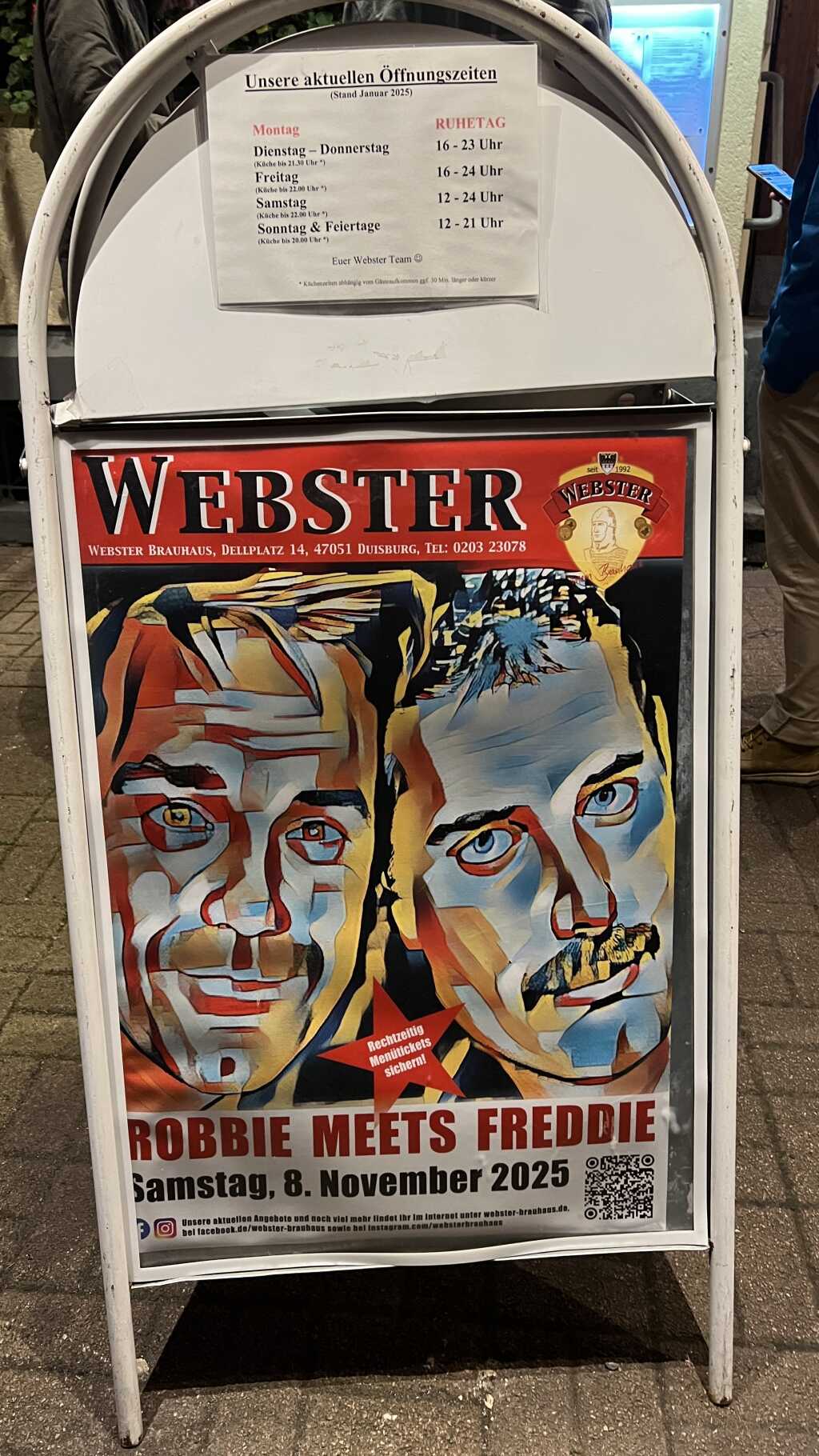Wir waren gestern Abend das dritte Mal im Webster Brauhaus. Das mag wenig erscheinen, allerdings kommen wir extra aus Wuppertal um einen schönen Abend zu verbringen. Das Brauhaus ist toll eingerichtet, das Personal ist sehr freundlich und schnell, die Toiletten sind sauber. Als Burger Fan bin ich voll auf meine Kosten gekommen auch die Pommes waren perfekt. Man konnte zwischen drei Menüs wählen oder nur trinken. Wie es sich für ein Brauhaus gehört gibt es auch sehr süffiges Bier. Wie die beiden vorigen Male waren meine Frau und ich zu einem Robbie Williams/Freddy Mercury Tribute das wir wieder sehr genossen haben. Das Brauhaus bietet aber auch andere Events, Brunches und z.B. eine Silvesterparty an. Würden wir in Duisburg wohnen wären wir sicher häufiger Gäste in dem schönen Lokal.