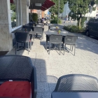 Wir hatten vorm Haus Platz genommen. Es gibt einfache Tische mit grauer sagen mal Kunststoffplatte. Dazu gibt es graue Gitterstühle. Auf manchen liegen rote Sitzkissen aus. Bei den Tischen an der Scheibe gab es auch etwas Schatten. Schirme gab es hier nicht.