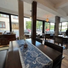 Das kleine Restaurant ist in einem Eckhaus untergebracht und hat zwei Fensterfronten mit fast bodentiefen großen Scheiben, so dass viel Tageshelligkeit in den Raum fällt. Zudem sorgt das Weiß der Decke und der Wände für Helligkeit. Die dunkle Möblierung liefert einen guten Kontrast, zumal die meisten Tische blank im Raum stehen. Damit Serin und Mann überhaupt auf 38 Plätze kommen, mussten sie die Tische eng stellen, was wir gar nicht schätzen. Unser Zweiertisch war ausreichend dimensioniert, so dass die zehn Mezeschälchen nicht gestapelt werden mussten.
