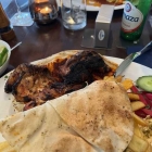 Gegenüber fiel die Wahl auf Kafta, das sind zwei Hackfleischspieße (19,90 Euro). Dazu eine Schale Reis (der Salat wurde vergessen). Ich fand die Spieße gut gewürzt (laut Serin sieben verschiedene Gewürze). Ich meinte Piment prominent herausgeschmeckt zu haben, was aber in der Aufzählung nicht vorkam. Ich hatte mir das halbe gegrillte Hähnchen Farouj Meshwi ausgewählt (18,90 Euro). Dazu dicke Pommes, Hummus und einen gut angemachten Salat. Das Huhn war von Serin mit Knochen avisiert worden, was mich nicht stört, wenn das Huhn einen Garzustand hat, bei dem sich das Fleisch leicht vom Knochen lösen lässt. Eingeschlagen war der halbe Hahn in einen Fladen, der mit einer rötlichen Paste bestrichen war. Freigelegt sah ich dann, dass Teile der Haut verkohlt waren. Leider war auch das gehäutete Fleisch nur trocken und geschmacksneutral. Im Afrin sind die entbeinten Hähnchenschenkel aus dem Ofen demgegenüber ein richtiger Genuss. Von diesem Gericht muss ich abraten und es zieht die Gesamtbewertung des Essens auf 3,5 Sterne runter.