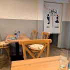 Und dieser etwas schmucklose Eindruck setzt sich im Inneren leider fort. Es ging wenige Stufen hinauf zu einem sehr funktional eingerichteten, recht schmalen Gastraum. Gleich zu unserer Linken werkelte „Mr. Dumpling“ (der Koch) hinter dem Tresen in seiner kleinen, offen einsehbaren Küchenecke. „Mrs. Dumpling“ (die Servicekraft) begrüßte uns sehr freundlich und wies uns einen Tisch im hinteren Bereich des hell gestrichenen „Dampf – und Mampfschuppens“ zu.