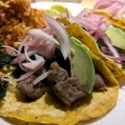 Das hübsch auf den Teller gebrachte, mexikanische Streetfood bestand aus drei Maistortillas, die mit gebratenen Steakwürfeln (wahrscheinlich von der Rinderhüfte), frittierter Petersilie, gepickelten Zwiebeln und Avocado-Spalten gefüllt waren.