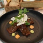 Meine Begleiterin wählte das Wiener Schnitzel mit Kartoffel-Rucola-Salat und Preiselbeeren für 28,50 Euro. Das ist der Preis für die mittlere Portionsgröße, die mit drei Schnitzeln üppig ausfiel. Alles schmackhaft, wie bekundet wurde. Ich bekam den Kabeljau mit Briochekruste, Kräuter-Senfsoße, grünem Spargel und Chorizopüree für 33,50 Euro. Auch diese Portion gut bemessen und hier passten die Geschmackstreiber. Auf die Idee, ein Püree mit Chorizostücken aufzupimpen, muss man erst einmal kommen! Auch gut gewürzt die Soße. Die Briochekruste positiv interessant. Drauf liegt eine Erbsensprosse, wie auch auf den Vorspeisen, die überraschend frisch erbsig rüberkam.