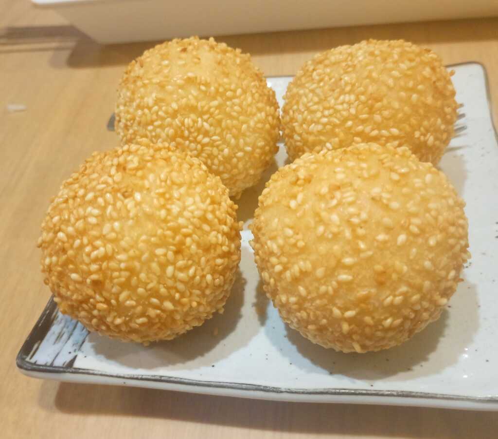 Nachtisch gibt es auch in der Liste. Wir nehmen vier Sesambällchen. Die sind extrem heiß. Schmecken aber nicht jedem am Tisch, zu sehr kleben die mit Bohnenpaste gefüllten Kugeln am Gaumen.