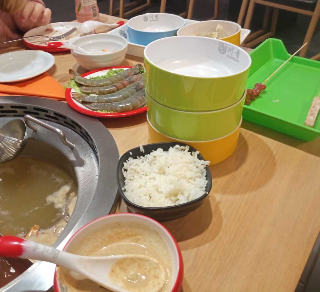 In der Kühlung natürlich einige Auswahl an Nudeln für die Suppe, zB Instandtnudeln, Udonnudeln. Dazu Fisch, Rindfleisch, Schweinefleisch, Ente. Gyoza Teigtaschen. Frühstücksfleisch und und und. Auch Sachen, die ich gar nicht lange anschaue wie Innereien oder Hühnerfüsse. Alles an langen Spießen zum praktischen Eintunken. Garnelen werden über das Telefon bestellt und werden an den Tisch gebracht, ebenso wie Reis. Der ist mit 2 Euro pro Schälchen günstig. 4 große Garnelen gibt es für 6 Euro. Die Spieße bzw die Fächer sind preislich ausgezeichnet, manche über 6 Euro. Es kann also schnell die Rechnung hochtreiben.