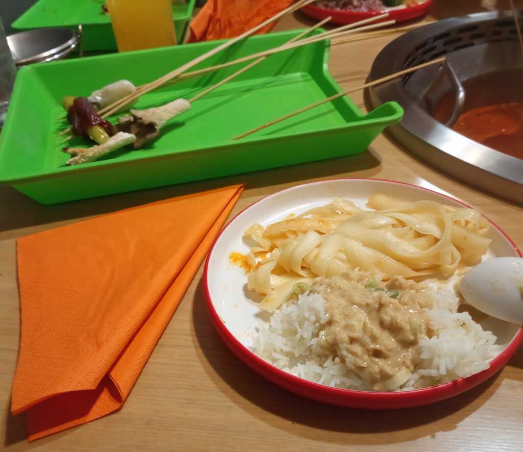 Die Menge an Suppe reicht üppig für ein ausgedehntes Essen, der Topf wird auch ständig geheizt. Einige Male kommt der freundliche Kellner vorbei und fragt lächelnd ob alles passt.