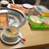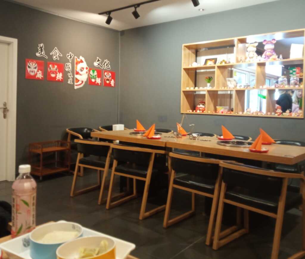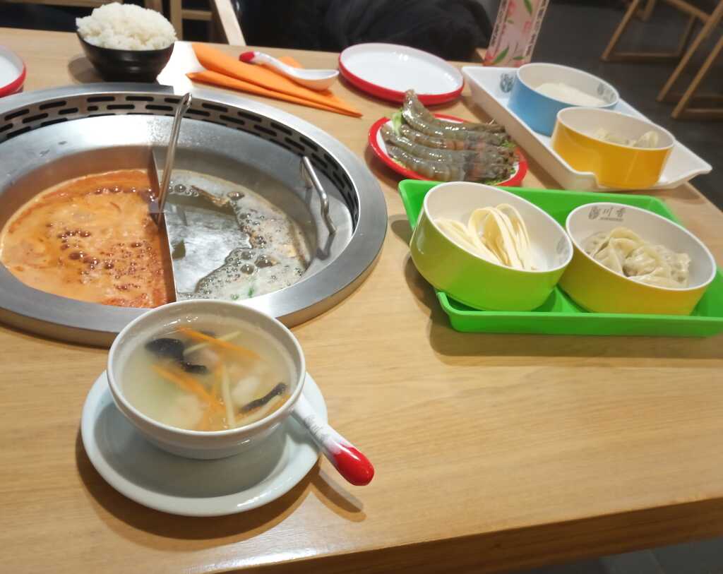 Der erste Eindruck beim Betreten entspricht nicht den Erwartungen. Nicht unbedingt gemütlich, schlichte Einrichtung. Wenig Tische. Diese sind schon eingedeckt mit je einem kleinen Teller und einer Serviette. Und natürlich eine Kochstelle für den Hot Pot eingelassen.