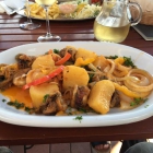 Dann für je 13,50 € der Tintenfisch am Spieß mit Pommes, Salat und der Cocktailsoße und einmal auf portugiesische Art.
