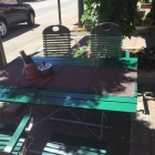 Um noch mehr Plätze im freien zu bekommen hat man Richtung Gehweg noch so Holzlatten-Klappstühle und Tische in grün bereit gestellt. Dieser Bereich wird mit roten Sonnenschirmen beschattet.