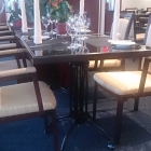 Ein freundlich wirkender junger Mann im schwarzen Anzug und lila Hemd mit Krawatte steuert auf uns zu. „Ah.. Familie Nolux..“ und reicht jedem zur Begrüßung die Hand. Ich hatte ihn sofort lieb gewonnen. In seiner fröhlichen Art wies er uns drei Tische zur Auswahl an. Ca. 100 Gäste haben hier Platz. Hauptsächlich Tische für sechs Personen stehen hier. Gut 20 Gäste einer Golfertruppe waren schon anwesend, mit Getränken versorgt. Draußen waren ebenfalls ein paar Gäste auf der beschirmten Terrasse.