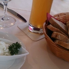 Man servierte uns dann Kräuterquark und zweierlei Sorten Brot. Der Quark hausgemacht und konnte gefallen, das Brot war nichts Besonderes, auch eher trocken. Mittlerweile schlurften die Golfer über den blauen Teppich zum Buffet um sich die Teller voll zu laden. Wir bekamen überraschender Weise einen Gruß aus der Küche…