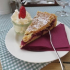 Das besondere am Mailänder Kuchen ist, daß auf dem Mürbeteig-Deckel Mandelblättchen mitgebacken werden, das gibt dem Kuchen eine knusprige, nussige Note. In den Schattenmorellen fand ich glücklicherweise keinen Kern – ich bin da immer etwas vorsichtig – die (leider) ungesüßte Sahne kam separat in einem Gläschen mit frischer Erdbeergarnitur. Hervorheben möchte ich, daß der Mürbeteigboden absolut spitzenmäßig seinem Mürbe-Namen alle Ehre machte!