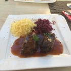 Meine Frau hatte sich für den Sauerbraten entschieden. Gut geschmorter Rinderbraten wurde serviert. Leicht säuerlich, sie war zufrieden mit dem Braten, die Sauce war einen Tick zu fest abgebunden, der Koch hatte zu viel Bindemittel in die Sauce gegeben, geschmacklich okay, aber die Konsistenz nicht mehr angenehm. Meine Rouladen waren auch gut geschmort, die Füllung war nicht so meines. Oma machte immer Gurke, Senf, Speck und Zwiebel in die Roulade, so mag es der Norddeutsche. Diese Rouladen waren mit einer Art Farce gefüllt aus Schinken (zu mager) und Gurken und Zwiebeln. Das war nicht so meines, allerdings waren auch die Rouladen ohne Tadel geschmort und zart. Die Beilagen waren bei beiden Gerichten gleich, Rotkohl und Spätzle. Der Rotkohl war gut, hausgemacht, weil mit einer sehr speziellen Geschmacksnote, die ich aber nicht festmachen konnte. Die Spätzle kamen aus der Tüte, meinte die Schwäbin (meine Frau).