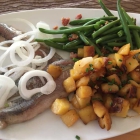 Hier werden Klassiker wie traditionelle Schnitzel oder typisches vom Niederrhein wie Grünkohl oder Dicke Bohnen mit Speck, Sauerbraten und Speckpfannkuchen angeboten. Von der Saisonkarte gab es Matjes. Wir wählten die Matjes "Hausfrauenart an einer Sauce mit Äpfel, Zwiebeln, Gurken und Sauerrahm dazu Salzkartoffeln (9,60€). Als zweites Gericht die Matjes "van Heijst" mit Zwiebelringen, Speckbohnen und Bratkartoffeln (9,60€). Beide Gerichte wurden nur lauwarm serviert. Ungewohnt für uns war der Matjes mit Schwanz und einigen Gräten. Soweit ich weiß, ist dies aber in der Gegend normal. Die Salzkartoffeln gut gegart, die Bratkartoffeln in der Pfanne zubereitet. So soll es sein. Beim Matjes van Heijst war noch eine kleine Salatgarnitur mit auf dem Teller, bestehend aus Karottenstreifen, einem Tomatenviertel und Blattsalat. Das ganze mit einer Himbeervinaigrette angemacht passte irgendwie überhaupt nicht dazu, da die Vinaigrette mit der Zeit sich auf dem Teller verteilte. Fisch mit Himbeergeschmack -nicht mein Ding. Beim bezahlen gab es keinen Bon.