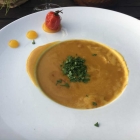 Als Vorspeise ein mal eine Currysuppe, beschrieben als "cremiges, fruchtiges Curry-Süppchen mit gebratener Hähnchenbrust und Shrimps" (EUR 7,90). Die Beschreibung ist perfekt. Absolut cremig, leicht süßlich. Guter Anfang für mich.