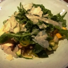 Mal wieder. Fräulein und der Pulpo. Hat ja auch Recht. Ist schon was Feines. Zu Beginn empfand ich das Gericht etwas Langweilig. Mit Meeresgetier wurde nicht gespart, davon gab es genug und das auch perfekt zubereitet. Dazu gab es auch ausgelöste Miesmuscheln, grüne und gelbe Zucchini. Über allem leicht angemachter Rucolasalat und Parmesanspäne. Später, als ich den Teller leer essen durfte bekam das Gericht für mich einen anderen Charakter. Durch den Muschelsud unten drin wurde das Gericht rund. Das schmeckte nach Meer, aber nicht zu dominant. Durch die leichte Bindung wurde das etwas kompensiert. Die Nudeln sichtlich hausgemacht und gut gekocht. Wieder ein feines Essen. Fräulein hatte an dem Abend glückliches Händchen. 5*
