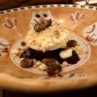Optisch reizvoll präsentiert sich die offenbar in Roter Bete gebeizte Lachsforelle mit Scheiben von der Ringelbete, fruchtigem Aprikosenchutney, säuerlicher Crème fraîche und außergewöhnlich nussig schmeckenden Pinienkernen. Das ist nicht nur schön anzuschauen, sondern in diesem Rahmen auch sehr komplex und wohlschmeckend.