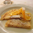 Als Küchengruß bekamen wir ein Töpfchen mit Apfel-Griebenschmalz und kleinen Landbrottranchen, insgesamt kein Highlight. Eine heftige Enttäuschung war die meiner Frau servierte Zwiebelsuppe: nicht wie üblich in der kleinen Löwenkopfterrine sondern im normalen Suppenteller serviert, das darin schwimmende Brot nicht angeröstet, nur mit sehr wenig Käse überbacken und die ganze Angelegenheit total versalzen! Meine Frau gab nach wenigen Löffeln auf davon zu essen und schob mir den Teller herüber; mir reichten zwei Löffel um zu einem vernichtenden Urteil zu kommen: schlichtweg ungeniessbar! Die herangerufene Servicedame wollte nicht davon probieren, trug den Teller rasch ab und die Zwiebelsuppe fand sich später auf unserer Rechnung bzw. auf einem kleinen Begleitzettel als Storno wieder. Die excellenten Lammbratwürstchen versöhnten meine Frau indes rasch wieder, ebenso die reschen Bratkartoffeln, die Bohnen und mein ihr überlassener Salatteller. Ich hatte zu meine Kalbsnierchen Tagliatelle als Beilage bestellt, serviert wurden sie mit Bratkartoffeln. Ich wollte nicht schon wieder reklamieren und habe brav aufgegessen. Die Nierchen spitzenmässig, die Soße eher nicht: leichte Dijon-Körnersenf-Einsprengsel in einer geschmacklich nicht genau zu fassenden Bratensoße. Na ja. Für mich das Highlight des Abends waren meine Crêpe Suzette; genau so und nicht anders hat dieses Gericht zu sein. Punkt.