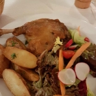 Zusätzlich zu der Normalkarte gab es wie immer die Tagesempfehlungen auf der Schiefertafel und eine separate Muschelkarte. Meine Frau bestellte von der Schiefertafel die Tagesempfehlung "Bliesgau-Rinderroulade von der Metzgerei Petermann, Oberwürzbach (die liefert auch die Entenbratwürste Salsiccia und Merguez für die "Zur wilden Ente"), mit Selleriepürree und Beilagensalat (EUR 18,50); als Dessert nahm sie "Crêpe Suzette" für EUR 6,50, als Getränke zunächst "ihren" Averna (EUR 3,00) und dann noch ein Pils (Bitburger, 0,25l EUR 2,40).Ich entschied mich gegen die Kalbsnierchen (preislich geklettert von EUR 18,50 im Februar auf nunmehr EUR 19,90; Corona-Notopfer ?) und stattdessen für die "Moules des Charentes in feiner Sauce mit Pineau de Charentes, Curry und Crême fraîche" (EUR 14,90), dazu eine Portion Pommes Frites (EUR 3,00) und als Dessert ebenfalls die "Crêpe Suzette". Getrunken habe ich Franziskaner Weizen dunkel (Flasche 0.5l EUR 3,90).