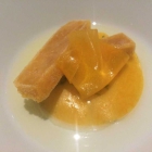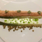 Im Menü geht es regulär weiter mit Blumenkohl, als Ragout und mit einer Emulsion aus Suppenfett und geröstetem Kalbshirn, dazu ein mit Petersilienöl verfeinertes, gestocktes Eiweiß. Ich probiere davon und finde es gut und erstaunlich abwechslungsreich, zumal Sebastian Franks Küche sonst eher reduziert auf den Teller kommt.