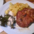 Ein Schweinerückensteak vom Grill mit Bratkartoffeln und Beilagensalat für 9,50 €. Das ist alternativ auch mit Fritten erhältlich. Ich habe geschwankt, ob die Kartoffeln kross daherkommen werden, wenn jetzt so eine Gruppe auf einmal ordert – „Noepp“. Es gibt nur einige krosse verlorene Kartoffelrestchen – mir wurde von den Vortags-Essern Anderes berichtet.