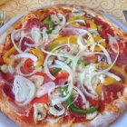 - Pizza Capricciosa, gemischt mit Salami, Schinken, Zwiebeln, Paprika und Pilzen - normal 6,50/groß 7,00 €