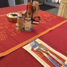 Die Tische sind eingedeckt mit roten Grundtischdecken aus einem komischen Material, keine Ahnung was das ist. Darüber gibt es noch einen roten Läufer der gemustert ist. Es gibt einen Aufsteller mit Bierangebot, Salz-und Pfefferstreuer und einen Windfang Aschenbecher.