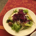 Der gemischte Salat bestand aus Krautsalat der sehr zart abgeschmeckt war, Blaukraut das mehr würze hatte, rohen Zwiebeln, gemischten Blattsalaten auf dem ein Joghurt Dressing war das mit etwas Kräutern verfeinert war uns aber zu süßlich und säure fehlte uns ein wenig, einer Peperoni mit sanfter schärfe und einer guten Olive. Die Zutaten alle frisch, schön mal nicht nur der Eisbergsalat, aber uns fehlte der Geschmack.