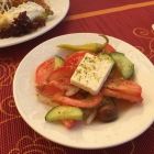 Der Bauernsalat bestand aus der gleichen Olive und Peperoni. Hier gab es Tomaten die sogar etwas Geschmack hatten, rohe Zwiebeln und Gurkenstückchen. Ein Stück Schafskäse mit schönen Geschmack und leicht cremig begleitete den Salat noch. Bestreut wurde das ganze noch mit getrockneten Kräutern. Hier gab es ein Essig-Öl-Dressing das schön ausgewogen war und eine passende Säure hatte. Dieser Salat schmeckte uns .