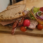 Zum Würzen gab es frischen, geriebenen Kren und einige Ringe frischer, roter Zwiebel. Garniert war das Ganze mit kleinen, halbierten Cocktailtomaten. Zusammen mit dem frischen Brot eine leckere Brotzeit.