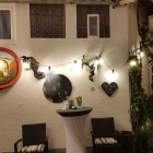 Der Tisch war mit einem grünen Tischläufer belegt auf dem dann Salz – und Pfeffermühle sowie ein kleines Teelicht stand. Der Eingangsbereich und Gastraun ist mit sehr vielen Bilder und Zeitungsberichten geschmückt.