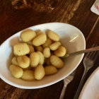Um es kurz zu machen: Diese Tournedos gehören zu den am besten zubereiteten Fleischspeisen, die ich in den letzten Jahren gegessen habe. Sie sind butterzart und saftig, zartrosa wie gewünscht und nehmen es glatt mit den vorzüglichen Sous-vide-Zubereitungen auf, die meine Frau auf den Tisch bringt. Mein erster Eindruck ist wegen der Zartheit und des minimalen Röstrandes außerhalb des rosaroten Fleisches deshalb auch, dass die Tournedos sous-vide gegart worden sein könnten. Die Sauce ist bestens zubereitet und die Kartoffel-Speck-Taler machen ihrem Namen ebenfalls alle Ehre. Beim Verzehr dringt der Speckgeschmack durch.