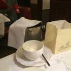 Mit dem Champagner kam frisches Baguette, serviert in einer Papiertüte, mit einem Sahnequarkdip. Die für unseren Tisch zuständige Kellnerin ließ uns ein wenig Zeit und erfragte dann unsere Auswahl.