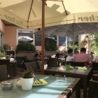 Trotz Reservierung bedurfte es einigen Tischerückens, uns sechs (vier Erwachsene, zwei Kleinkinder) auf der beengten Terrasse unterzubringen. Ein bisschen gewöhnungsbedürftig ist auch, dass die Terrasse direkt an der bürgersteiglosen Straße liegt, denn wenn man am Rand sitzt, braust der Verkehr einen halben Meter hinterm Rücken vorbei und mischt sich ins Tischgespräch ein. Aber gewöhnungsbedürftig heißt nicht, dass man sich nicht daran gewöhnen kann.