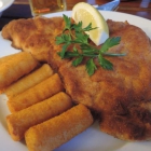 Die paar „Alibi-Salate“ mit Dressing nach Wahl (Haus-/Balsamico-/Honig-Senf-Dressing) gab es mit gebratenen Scampis, Roastbeefstreifen und Putenbruststreifen. Also auch hier befand sich der Vegetarier auf fränkisch-fleischlustigem Feindesland und musste schauen, dass er seinen Hunger nach Pflanzlichem irgendwie anders gestillt bekam. Aus der Pfanne und vom Grill kam mit Schnitzel, Cordon Bleu, Bauernsteak, Schweinelendchen, Rumpsteak und Co. nahezu das komplette „who-is-who“ deutscher Fleischeskost. Und das zu unglaublich günstigen Preisen. Am Nachbartisch versuchte eine junge Dame ihrer beiden panierten Schnitzel auf ihrem Teller Herr(in) zu werden. Die sahen wirklich sensationell knusprig aus. Für 7,80 Euro mit einer Beilage nach Wahl und einem kleinen Salat vorweg war das ein Angebot, das ich nicht ablehnen konnte.