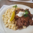 Die Soße vom Gulasch war schön sämig und mit Zwiebeln und Fleischsträhnen durchsetzt. Ein richtig gutes Gulasch, so wie ich ihn auch von zu Hause kenne. Ob die Nockerln selbst gemacht sind wissen wir nicht, meiner Frau schmeckten sie jedenfalls ganz gut. Eine kleine Beilage aus Weißkrautsalat gab es ebenfalls, dessen Geschmack kennen wir aus dem Discounter.