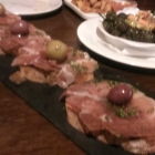 Vier Scheiben frisches, geröstetes Weisbrot mit Serranoschinken und on Top eine große Olive auf jeder Scheibe, serviert auf einem länglichem Schiefertablett. Das Ganze abgeschmeckt mit Olivenöl und Kräutern für sich schon fast ein kleiner Hauptgang.