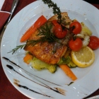 Mein Teller sah sehr appetitlich aus. Rucola konnte ich sehen, geschmorte Minitomaten und gehobelter Parmesan obenauf. Meine Freundin bekam ein Riesenstück Lachs auf Gemüsebett, eine kleine Platte mit Gemüse und dann noch eine mit Rosmarinkartoffeln.