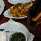 Wir tranken also unseren Weißwein und unterhielten uns. Nach etwa einer halben Stunde wurde unser Essen gebracht, einen Gruß aus der Küche gab es nicht--oder nur zu spät ? Ein Tablett mit 2 Dips und ein niedliches Stoffkörbchen mit warmen Brötchen kam zeitgleich mit dem Essen.