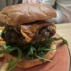 Der besteht aus 200 g argentinisches Beef | Briochebrötchen | Barbecuesauce | Cheddarkäse | Bacon | Gewürzgurke | geschmorte Zwiebeln Rucola | Pommes und meine Frau konnte selbstverständlich die Barbecue Sauce abbestellen. Der Freund gegenüber nahm den Burger mit. Der Gargrad wurde abgefragt und beide Patties kamen perfekt medium an den Tisch.