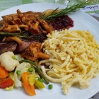 Rehsteak an Pfifferling-Wacholderrahm, Marktgemüse und hausgemachte Spätzle - € 25,80.