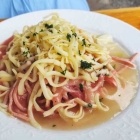 An dem dann doch mal wieder recht warmen Tag entschied sich meine liebe Frau für einen Schweizer Wurstsalat (12,80). Meinereiner fand es dem Tag angemessen ihn mit einem Zwiebelrostbraten (29,80) ausklingen zu lassen. Dazu noch einen kleinen Beilagensalat zu 5,50. Ja es wird scheinbar immer „normaler“ den Beilagensalat extra aufzuführen. Es nervt zwar, aber die Wirte kämpfen ja auch. Unserer hier vielleicht eher mit seiner Leibesfülle, macht es aber, gefühlt, auch nicht besser.