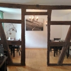 Nach freundlicher Begrüßung durch die Hausherrin, Frau Susanne Laquai, wurden wir zu unserem Tisch in der Beletage geführt. Im Erdgeschoss waren zu diesem Zeitpunkt schon alle Plätze belegt. Über eine knarrende Holztreppe ging es nach oben. Dort empfing uns ein kleiner Gastraum mit freiliegendem Fachwerkgebälk, hellem Holzdielenboden und großzügig – aktuell würde man dies wohl eher „vorbildlich“ nennen – verteilten, dunkel lackierten Holztischen.