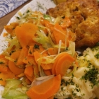 Beim gebutterten Möhren-Lauch-Gemüse sah man auf den ersten Blick das dies aus der heimischen Küche kommt. Dicke, große, kleine Scheiben Möhren, frischer, leicht zerkochter Lauch, und dass alles schön in Butter geschwenkt. So kommt das Gemüse auch auf dem heimischen Tisch auf den Teller.
