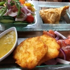 Für mich geht es weiter mit Flensburger Pannfisch. Das sind im wesentlichen vier Fischfilets, die recht ordentlich gebraten sind. Identifizieren kann ich sie nicht wirklich, angesagt werden sie auch nicht. Dazu gibt es Wirsing in einer guten Senfsauce, etwas kross gebratenen Speck, erneut Rührei (was haben die hier nur andauernd mit so viel Eiern??) und einer unmotivierten Scheibe Wassermelone als Deko. Separat im Schälchen noch Bratkartoffeln, die mit Speck und Zwiebeln gebraten sind. Das ist wahrlich kein Teller für Cholesterinfanatiker. Mein Kardiologe wäre not amused...
