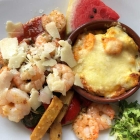 Unsere Freundin, von Haus aus eine eher schmale Esserin, begnügt sich nach dem Verzicht auf die Vorspeise mit der norddeutschen Spezialität einer Gambarettipfanne. Heißt das wirklich so? Auf diversem Grillgemüse mit Parmesan finden sich eine Handvoll Garnelen. Im Schälchen dabei etwas Süßkartoffelgratin, das etwas arg pampig mit Käse überbacken ist. Ach ja – und eine unmotivierte Scheibe Wassermelone. Ich habe das nicht probiert, aber angeprickelt hat es mich alles schon optisch nicht. Unsere Freundin war aber – leidlich – zufrieden.