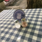 Auf den Tischen noch die gleichen karierten Tischdecken in weiß/blau, denen man das alter aber sehr ansieht. Darauf gibt es Salz und Pfefferstreuer und einen Halter mit Bierdeckel.