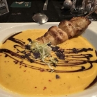 Zur Vorspeise wählten wir beide die Hokkaido-Kokoscremesuppe mit Hühnchenspieß, zu 8,90 Euro.