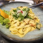 Tagliatelle Salmone mit Zwiebeln, Knoblauch, Lachs und Sahnesauce - € 16,50.